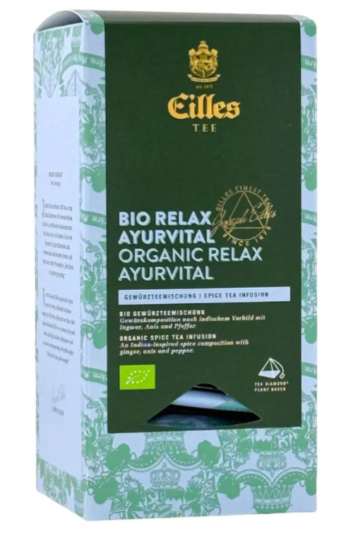 Čaj Eilles Tee BIO RELAX AYURVITAL přináší kořeněnou cestu k rovnováze inspirovanou ájurvédskou moudrostí. Fenykl, zázvor a anýz se jemně propojují se sladkým kořenem lékořice, skořicí a hřebíčkem, zatímco kardamom, pomerančová kůra a špetka černého pepře dodávají čajové směsi jiskru a hloubku. Výsledkem je aromatický zážitek, který probouzí smysly a zároveň přináší uklidnění.